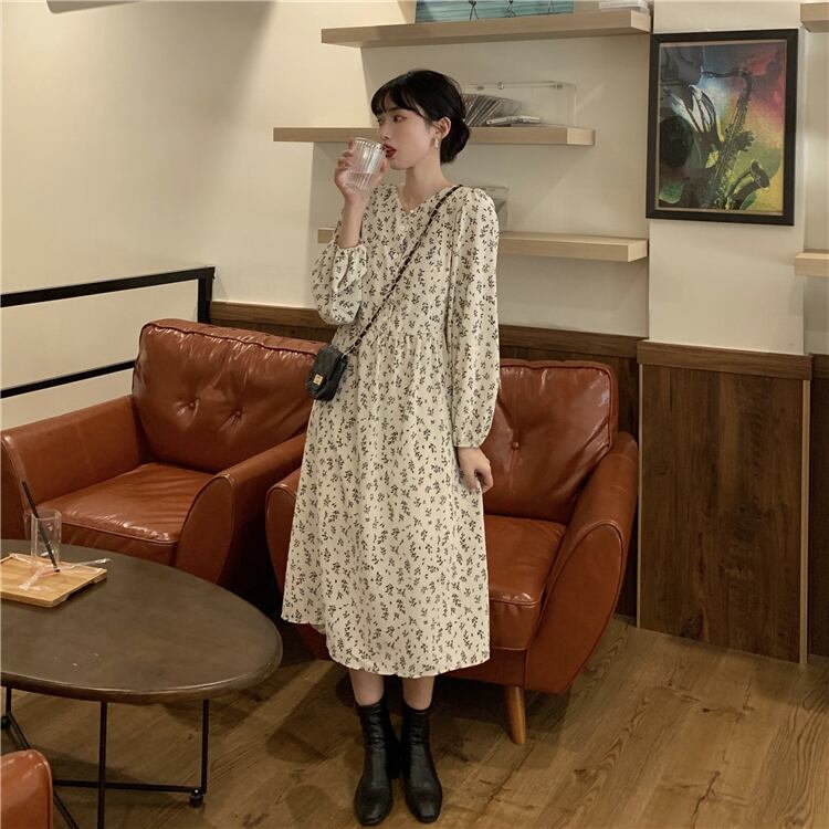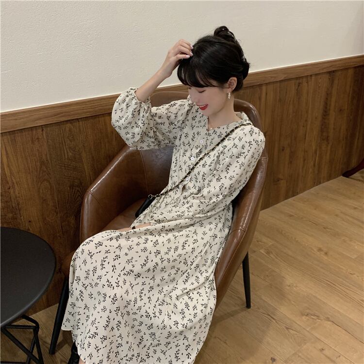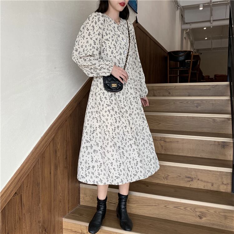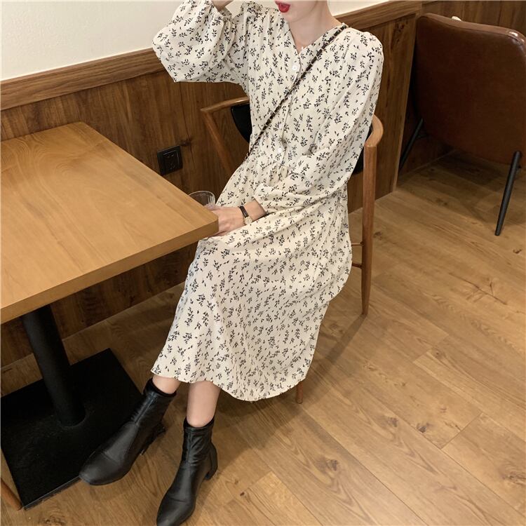 Vネックとレトロ配色の小花柄が抜け感のあるワンピース。