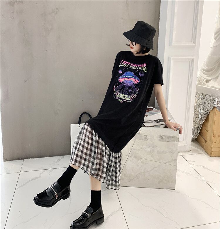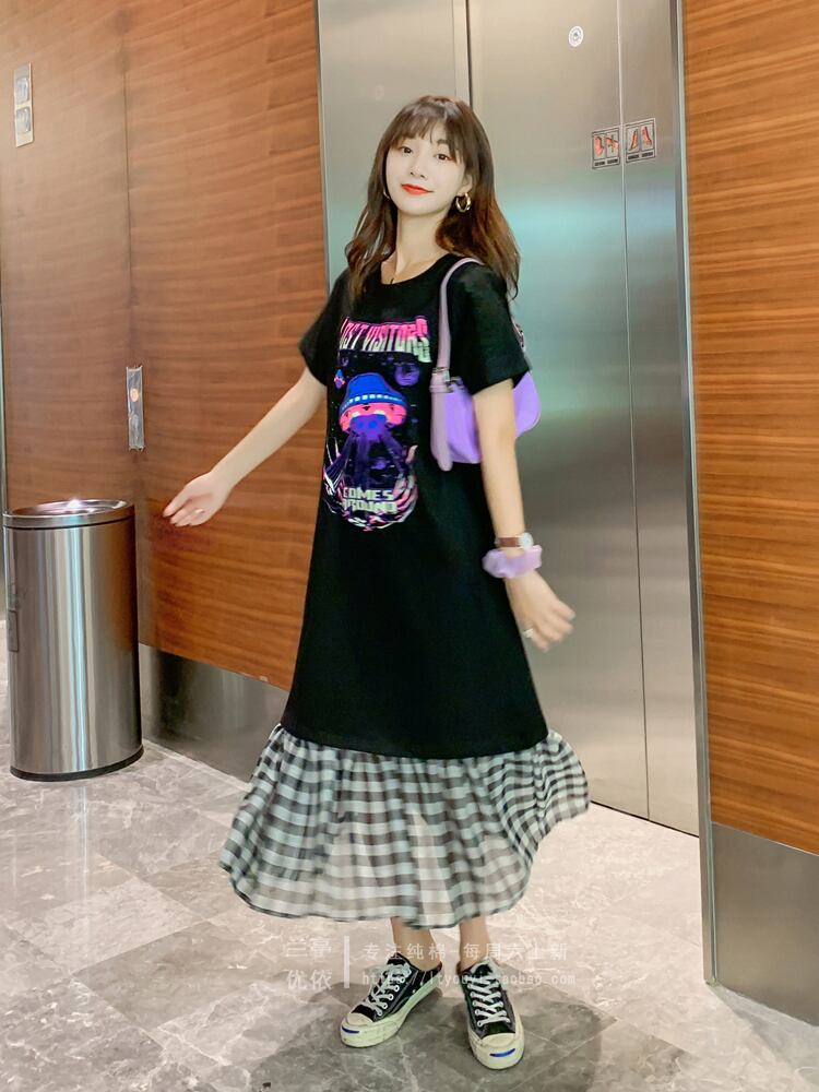 コットン Uネック スカート 重ね着風 ワンピース カジュアル 膝下 ミモレ ミモレ丈 袖あり 半袖 ドッキング 裾フレア かわいい 大人可愛い カジュアル お洒落 かっこいい 大人可愛い こなれ感 ラフ メンズライク マニッシュ ボーイッシュ スポーティー ルーズ 個性的 クール モード系 主役級 存在感 黒 ブラック 柄 春 夏 秋 10代 20代 30代 レディース 学生 通学 デート お出かけ 着回し 普段使い 重ね着 韓国 韓国系 オルチャン ファッション コーデ トレンド 流行 インスタ映え