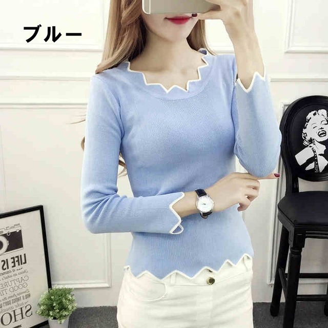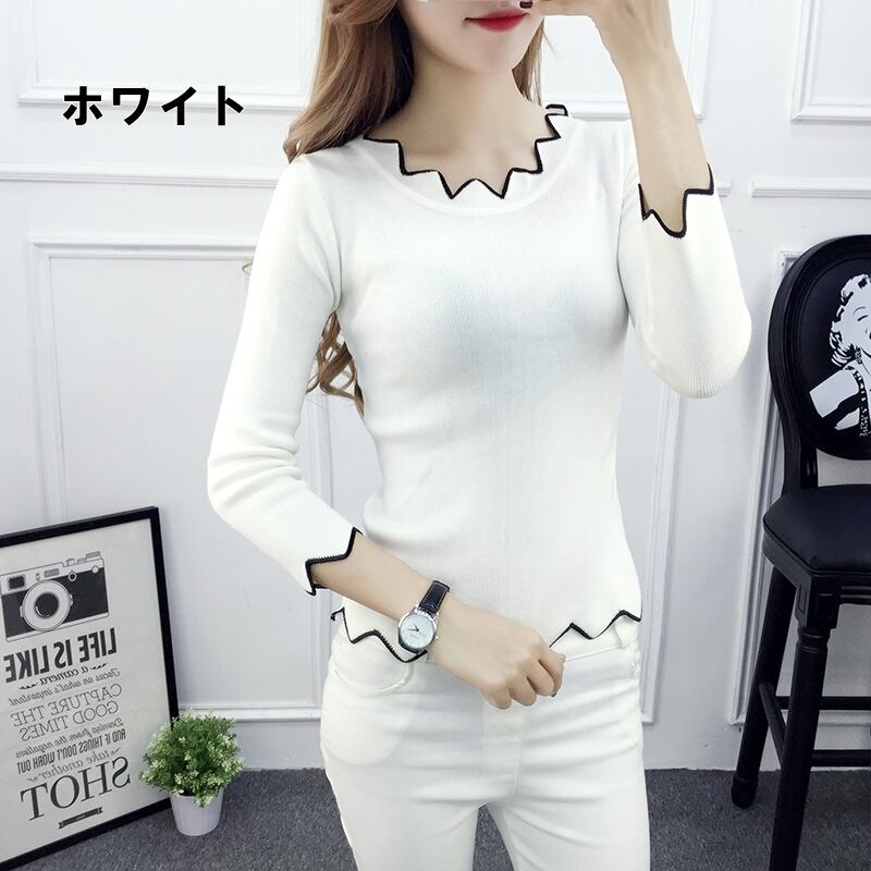 クルーネック ミドル丈 ニット 送料無料 5色 七分袖 スリム トリム バイカラー スカラップ トップス 袖あり スリム タイト 細身大人可愛い きれいめ シンプル 大人 上品 おしゃれ お洒落 大人可愛い 大人女子 ラブリー キュート クール モード系 セクシー エレガント モダン 白 ホワイト 黒 ブラック 青 ブルー 緑 グリーン 灰色 グレー ベージュ 無地 レディース オフィス ビジネス OL 通勤 学生 通学 デート 着回し 普段使い 韓国 韓国系 オルチャン モテ
