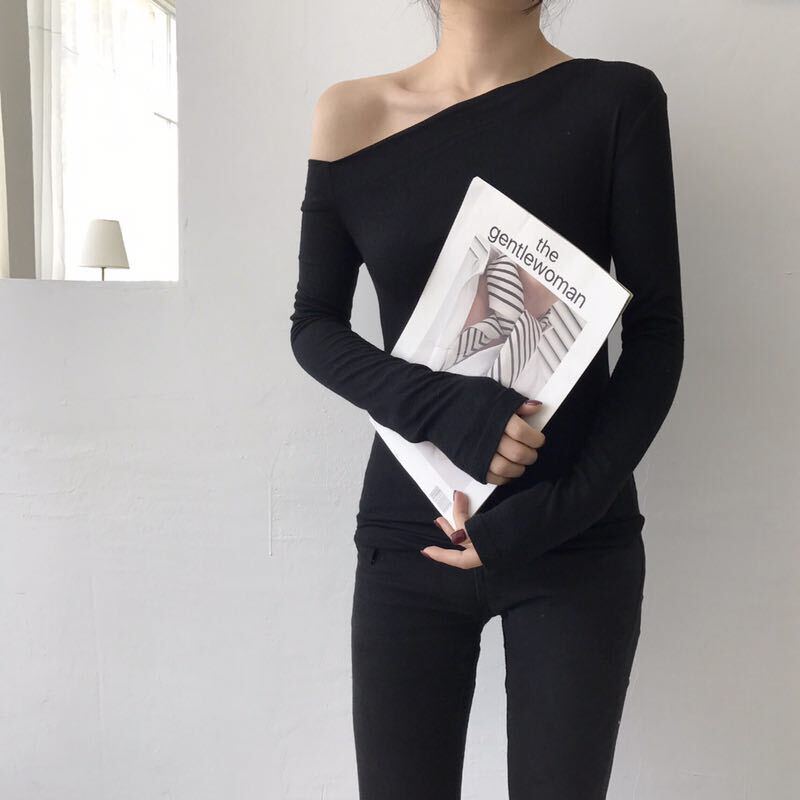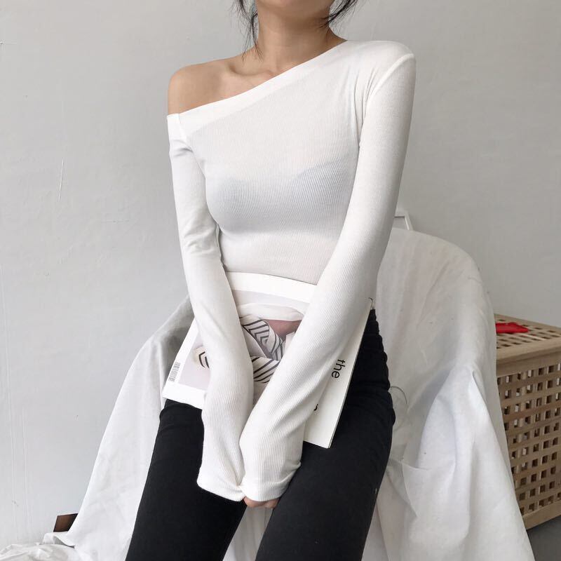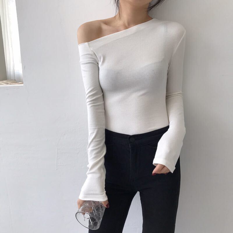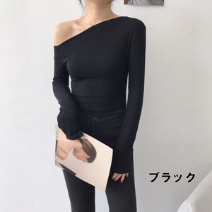 伸縮性に優れたタイトなシルエットのワンショルダーニット。