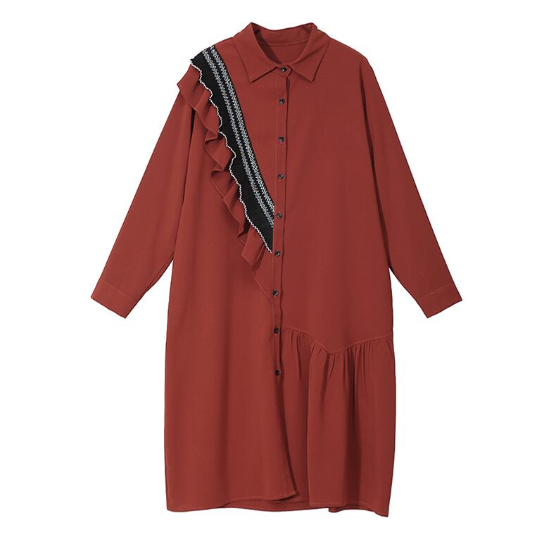 ドレープとフリルが上品なアシンメトリーシャツワンピース。