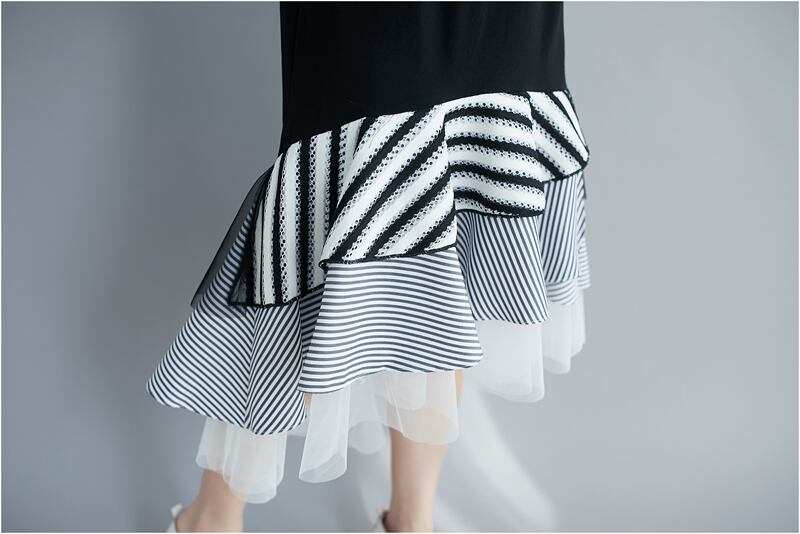 ワンピース レディース 送料無料 ティアードワンピース フレアワンピース ロングワンピース ミモレワンピース ドッキング フィッシュテール ラウンドネック 丸首 半袖 二の腕カバー ローウエスト ミディ丈 ミディアム丈 ミモレ丈 ロング丈 ブラック ホワイト バイカラー 縞模様 ストライプ柄 ボーダー シック モダン スタイリッシュ カジュアル ラフ ゆったり ゆる 楽ちん ガーリー かわいい 可愛い こなれ感 個性的 クール モード系 Aライン 春服 夏服 秋服 重ね着 デート おでかけ トレンド