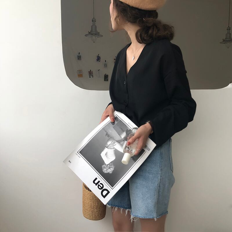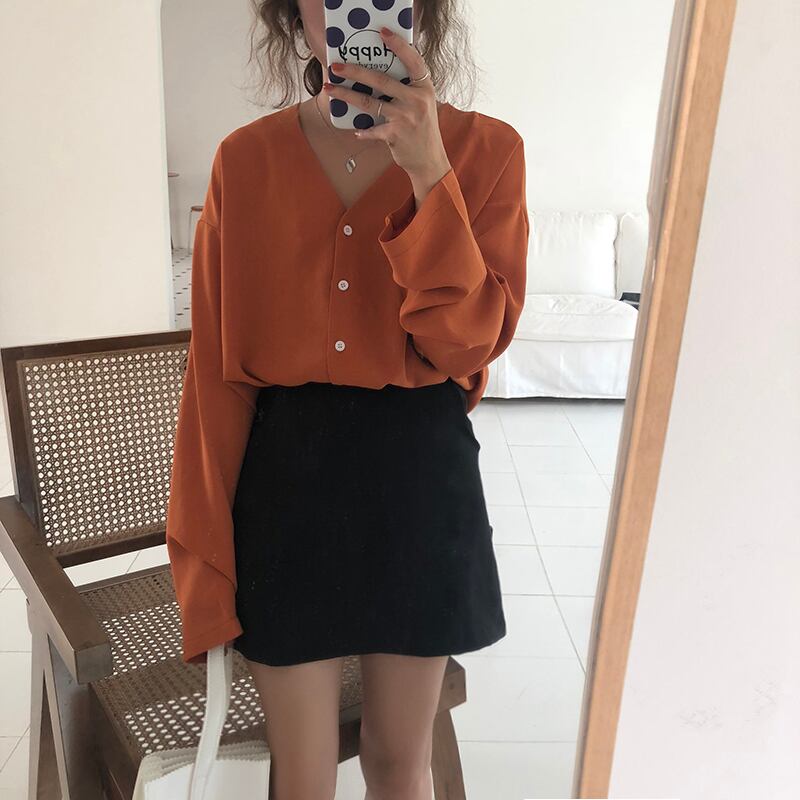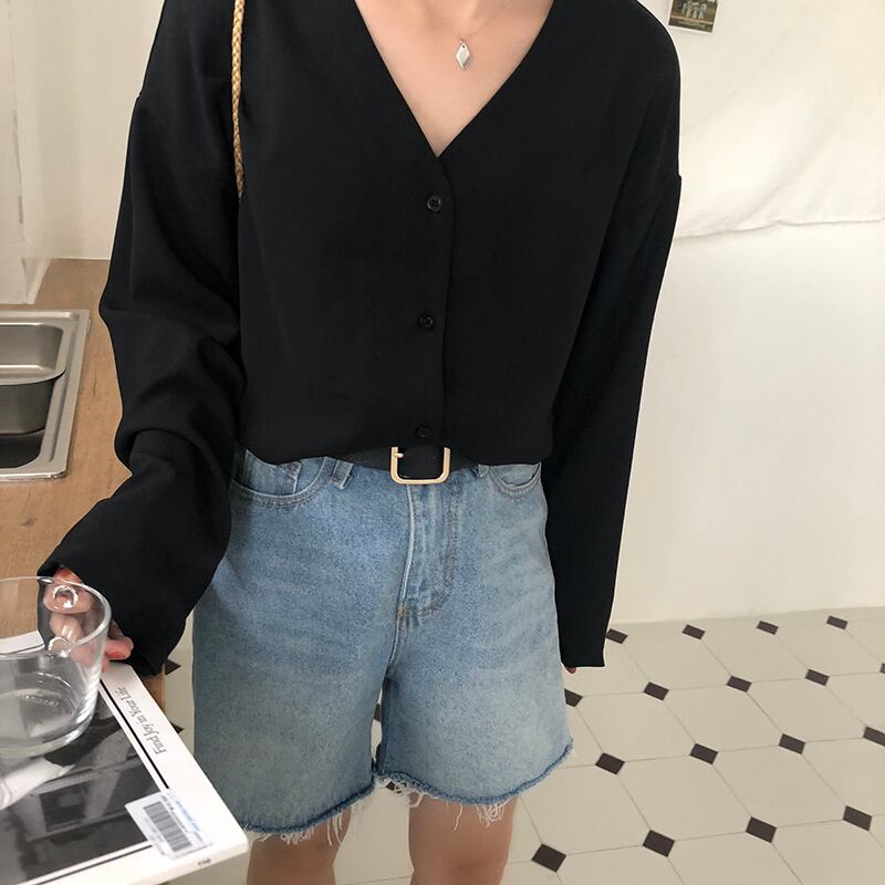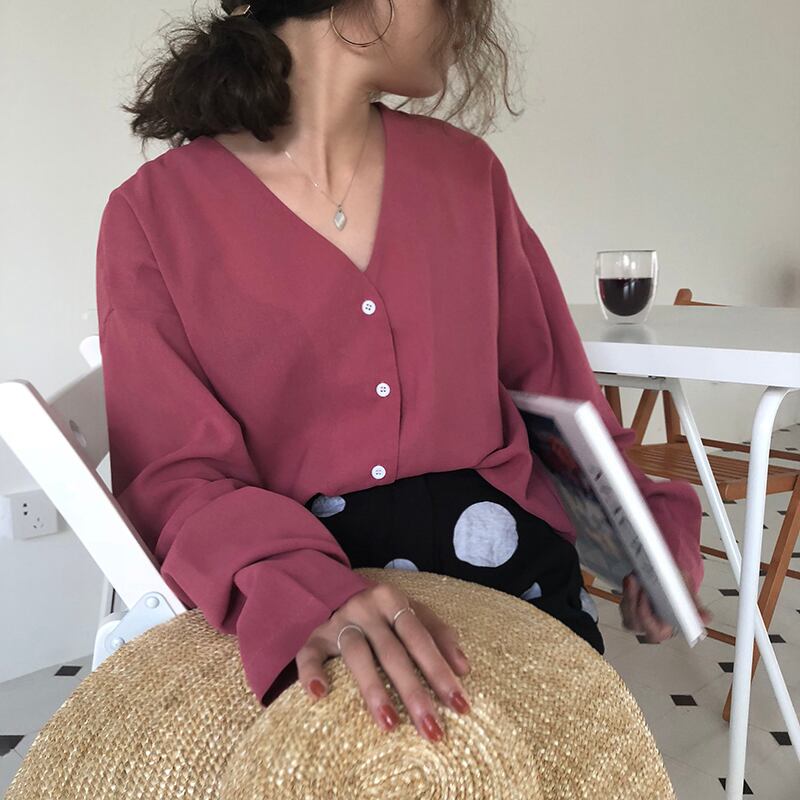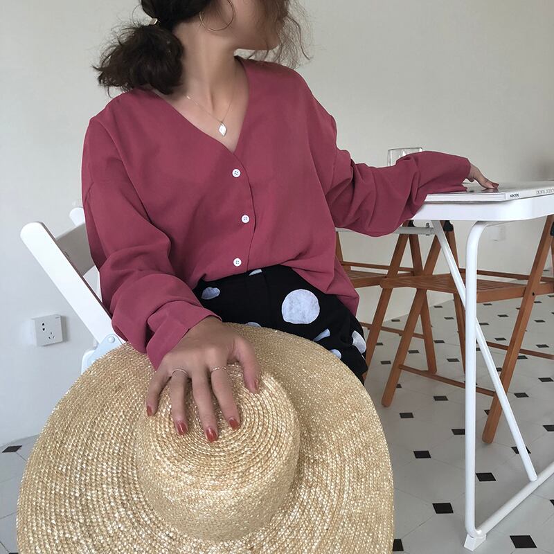 Vネックがクラシカルなシンプルシャツブラウスです。