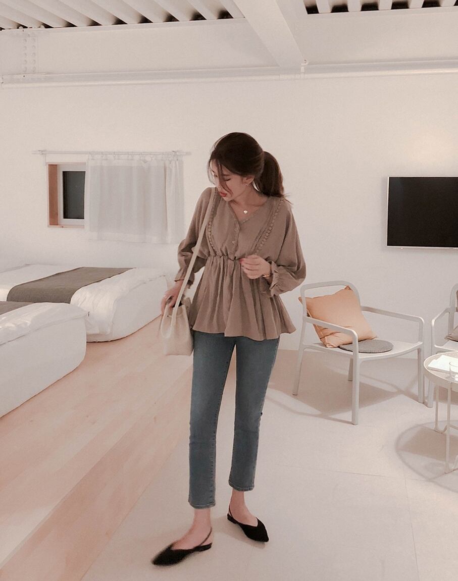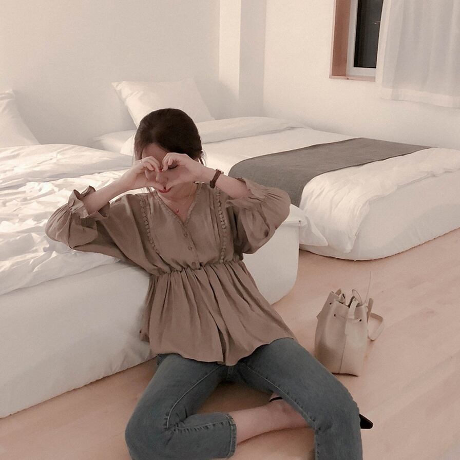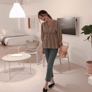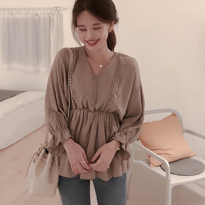 長袖 Vネック ミディアム ブラウス ペプラム レトロ カジュアル トップス 袖あり ボリューム袖 フレア ウエストマーク かわいい 大人可愛い きれいめ シンプル 大人 上品 おしゃれ お洒落 大人可愛い 大人女子 ラブリー キュート ガーリー とろみ感 茶色 ブラウン 無地 春 夏 秋 10代 20代 30代 40代 レディース 通学 デート お出かけ 女子会 休日 着回し 普段使い 重ね着 韓国 韓国系 オルチャン ファッション コーデ モテ トレンド 流行