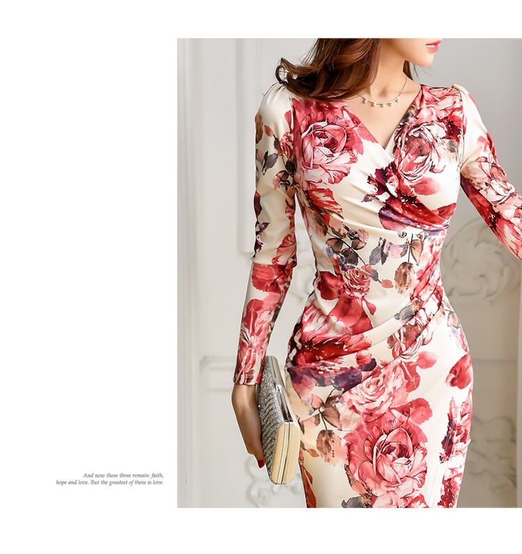 鮮やかなプリントがフェミニンでタイトなカシュクールワンピース。