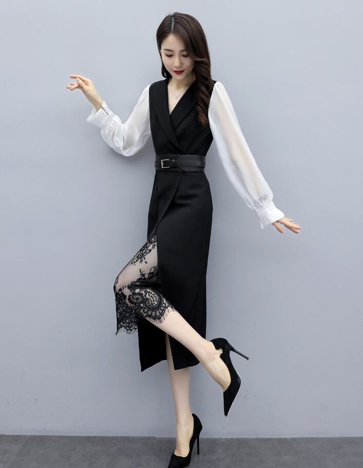 ドレス レディース 送料無料 ロングワンピース ミモレワンピース Vネック スリット レース 襟付き 長袖 プルオーバー ハイウエスト ウエストマーク ベルト ドッキング 体型カバー 細見え 着痩せ 脚長 スリム ブラック ホワイト バイカラー ロング丈 ミモレ丈 フェミニン 肌見せ 清潔感 清楚 抜け感 通気性 大人可愛い 大人女子 おしゃれ お洒落 上品 エレガント ラフ モダン シック セクシー カジュアル ガーリー ラブリー キュート きれいめ 春服 秋服 夏服 透け感 パーティードレス 結婚式