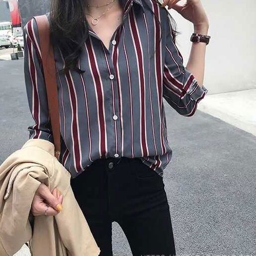 大人ハンサムなスタイルを確立する襟付きストライプ柄シャツ。