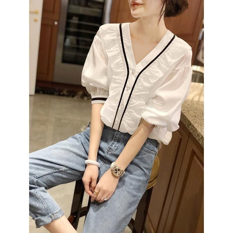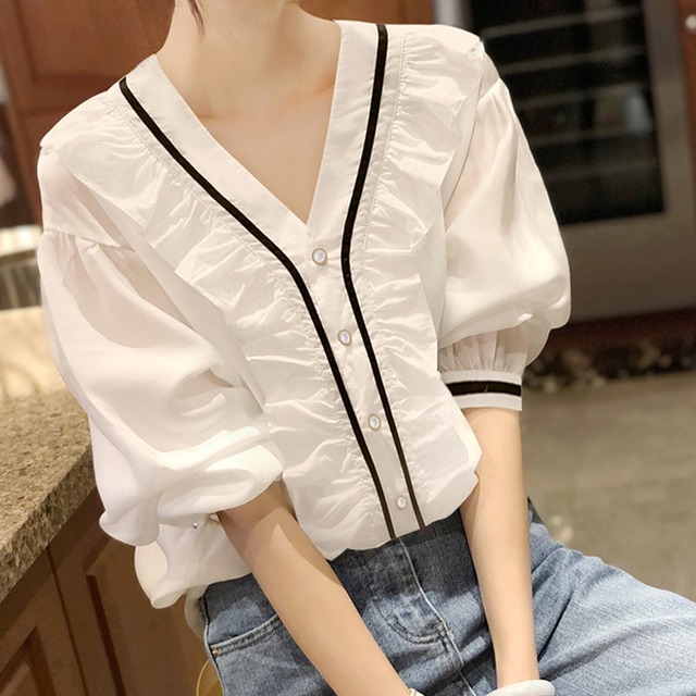 バストのバイカラートリムとフリルがフェミニンなブラウスです。
