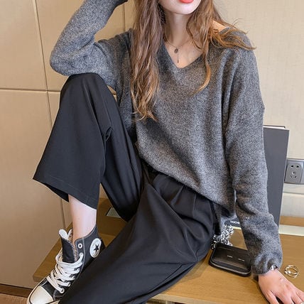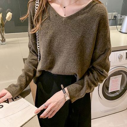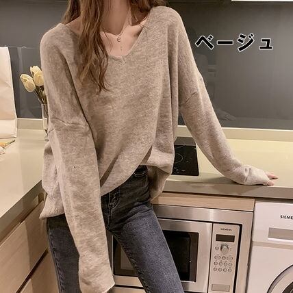 ふわっと柔らかい雰囲気の深めのVネックニット。