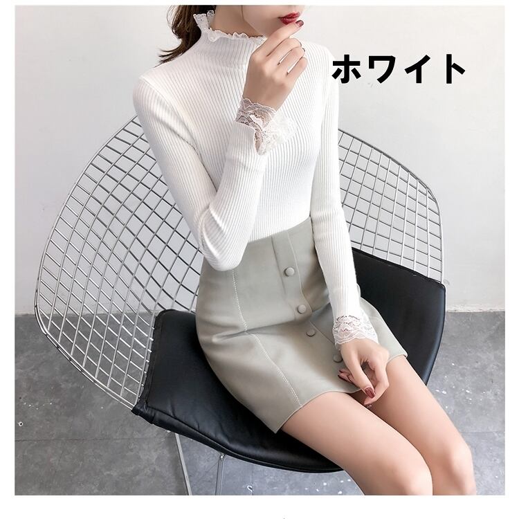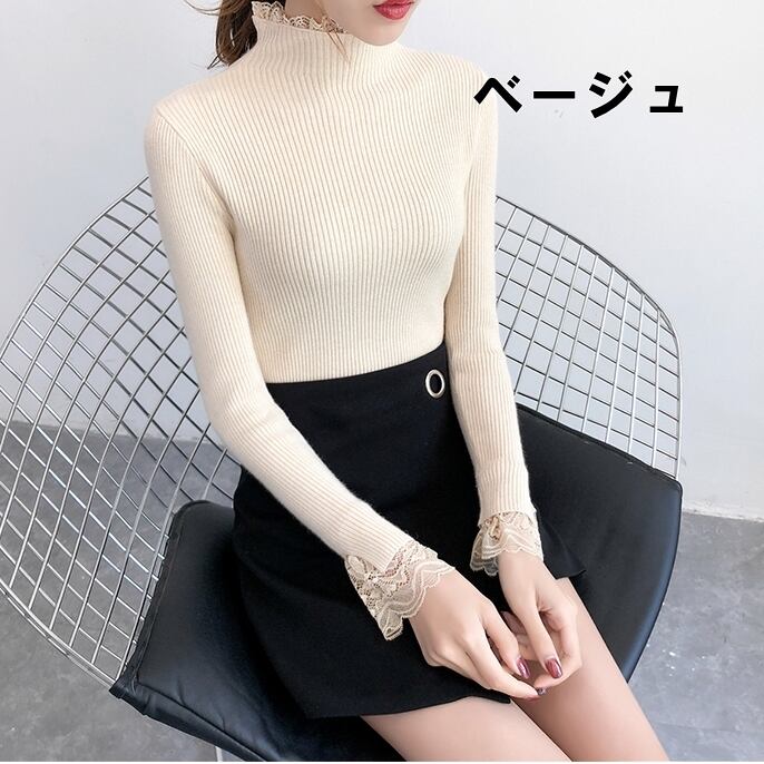 トップス リブニット レディース 送料無料 長袖レース 5色 リブ レース襟 フリル ランダムリブ ホワイト ベージュ ブラック サイズ4展開 S M L XL きれいめ レース袖 レース オフィス カジュアル ビジネス デート 通勤 着回し 重ね着 ランチ ディナー お泊り ママ友 ランチ レースポイントハイネック リブニット リブ 長袖 ハイネック 春 秋 冬