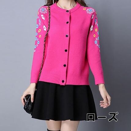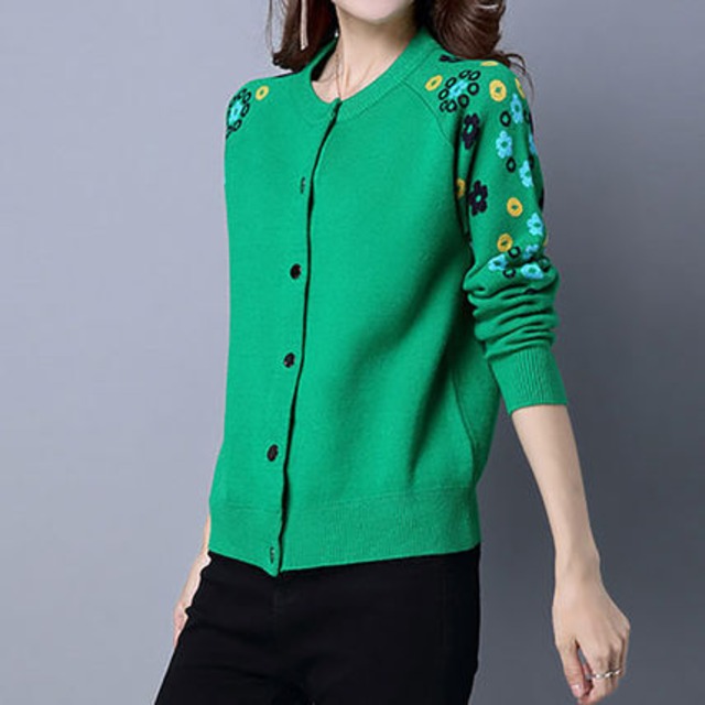 両肩に花柄をあしらった長袖カーディガン。