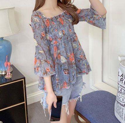 バックの繊細なリボン装飾がフェミニンな花柄ブラウスです。