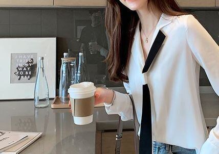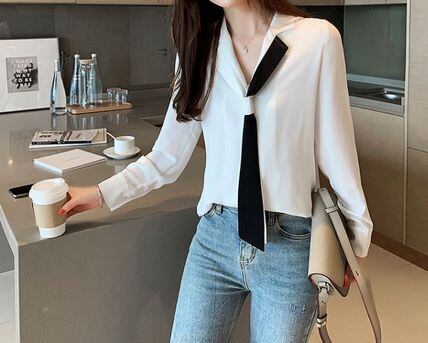 ベーシックなデザインのブラウスに、バイカラーボウタイがアクセントになっています。