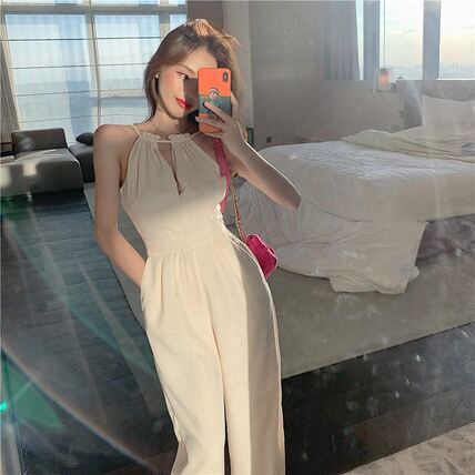 バストのスリットがセクシーなホルターネックが特徴的なジャンプスーツ。