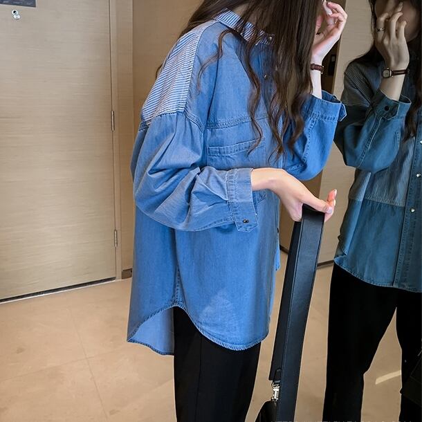 ボーダーとデニムシャツの切り替えデザインが魅力的な個性派アイテムです。