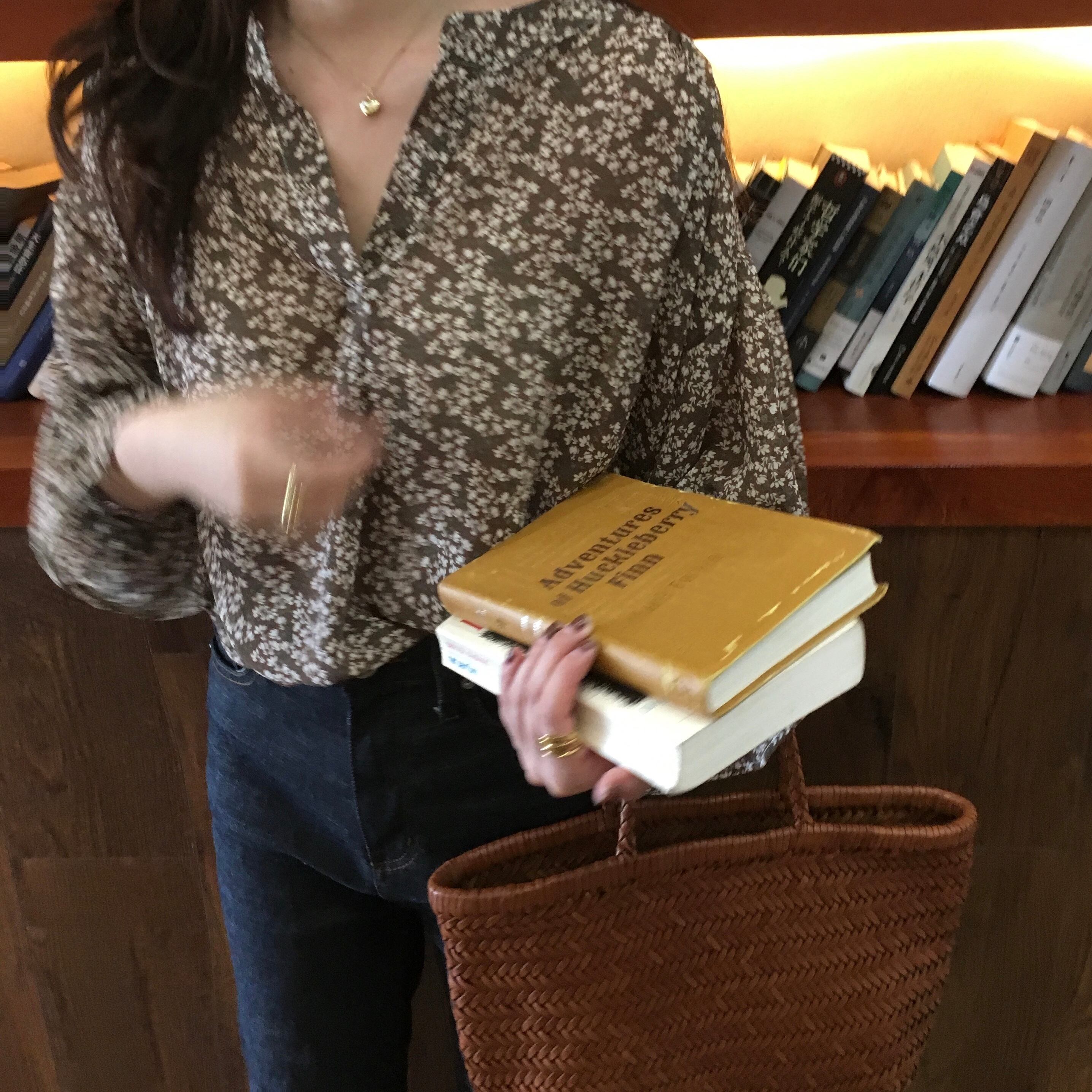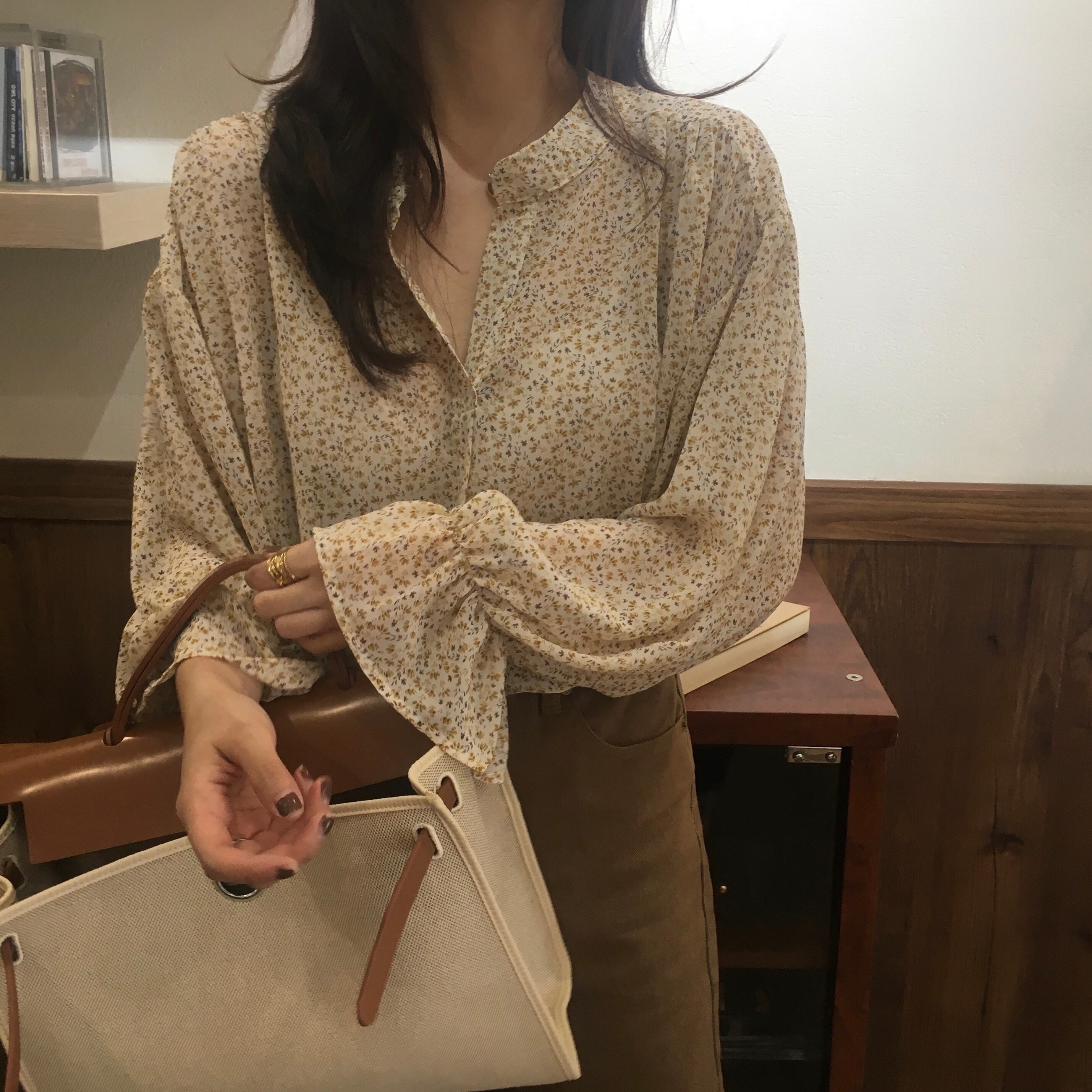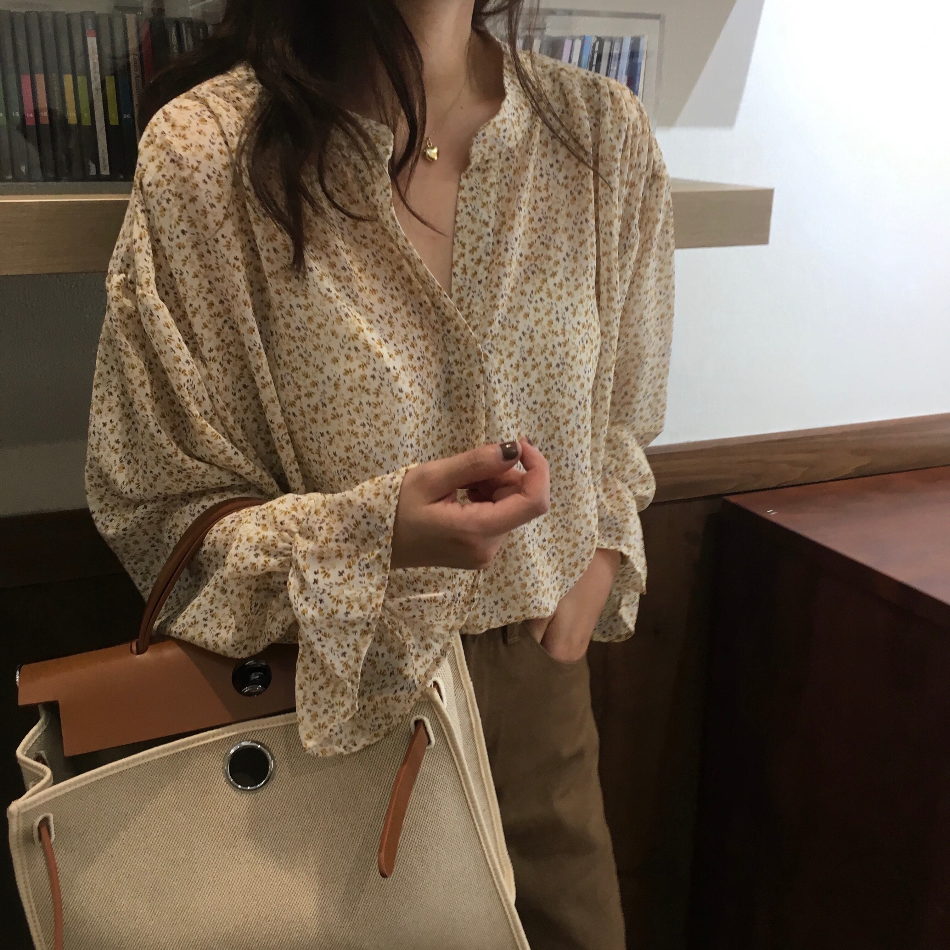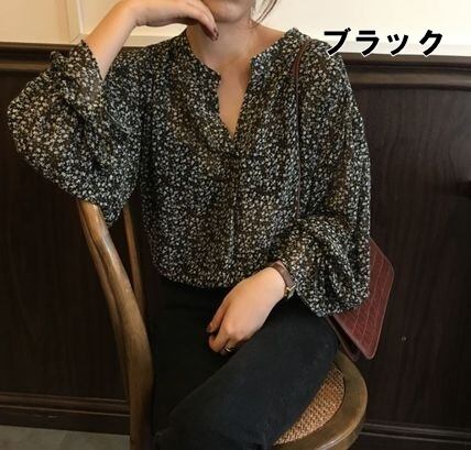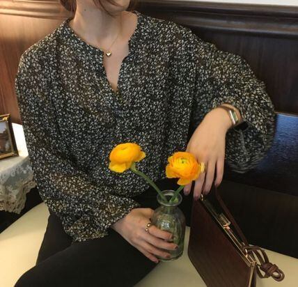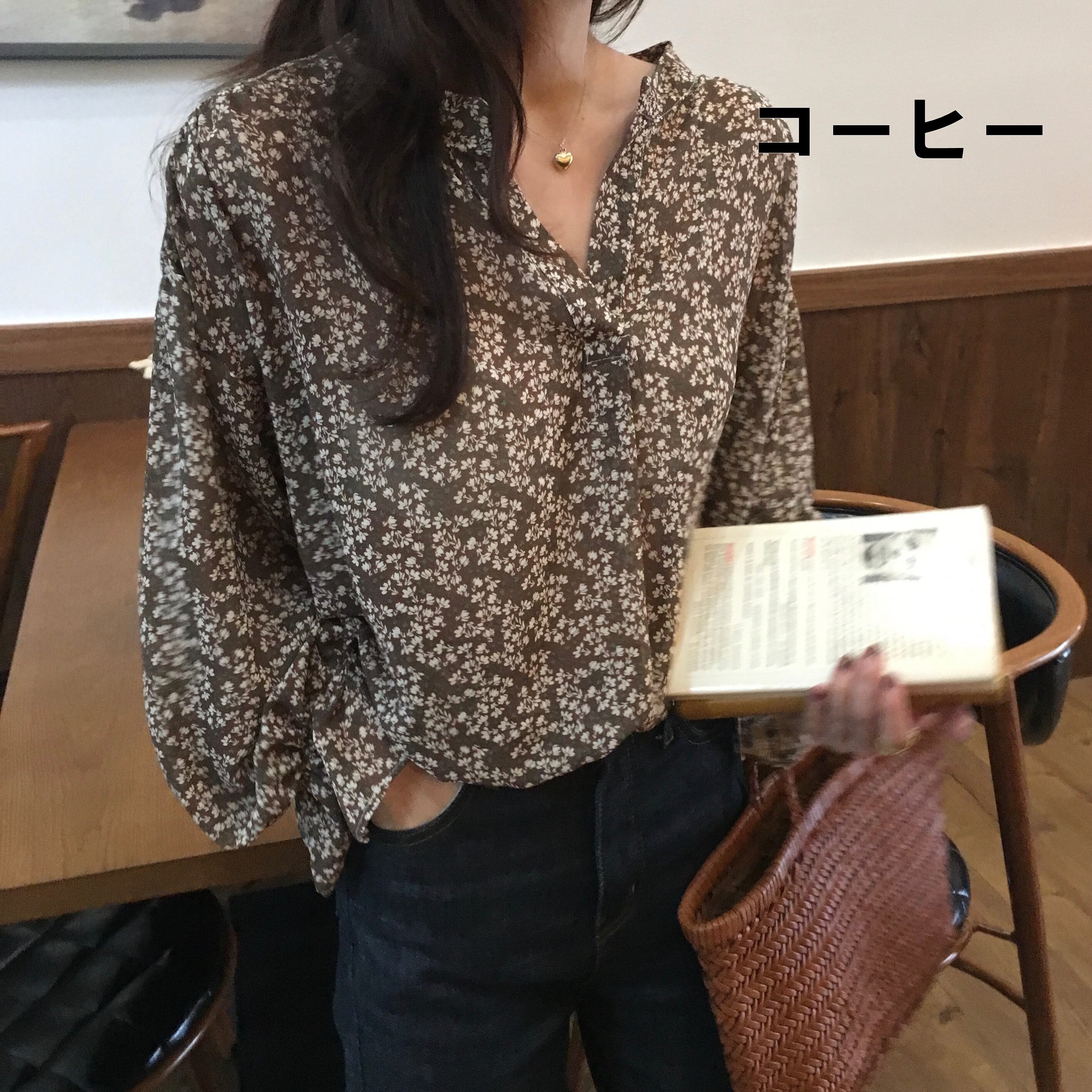 抜け感のある広めのVネックと小花柄がフェミニンなブラウスです。