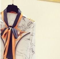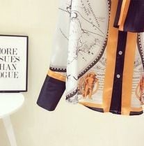 ゴージャスな幾何学模様であしらったリボンタイブラウスです。