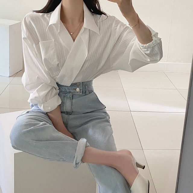大人ハンサムなスタイルを確立する襟付きストライプ柄シャツ。