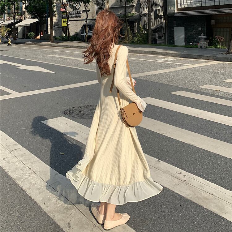 タイトなリブニットとふんわり快適なスカートのロングワンピース。