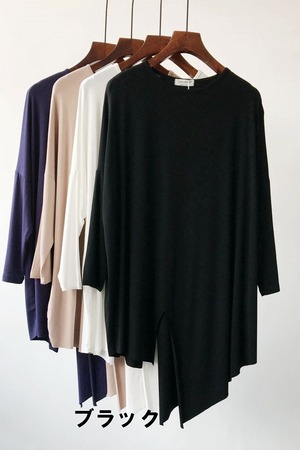トップス レディース 送料無料 4色 フレンチスリーブTシャツ 長袖 ロングTシャツ おしゃれ アシンメトリー スリット ブラウス スタイル 小顔見せ 着痩せ 体形カバー インスタ トレンド きれいめ コットン 綿 バックボタン オフィス 通勤 OL エレガント フェミニン クール モダン モノトーン カラーバリエーション ブラック ライトグリーン こなれ感 シンプル ベーシック 無地 夏 お出かけ アクティブ かっこいい クルーネック ラウンドネック ティーシャツ ブラウス スリット