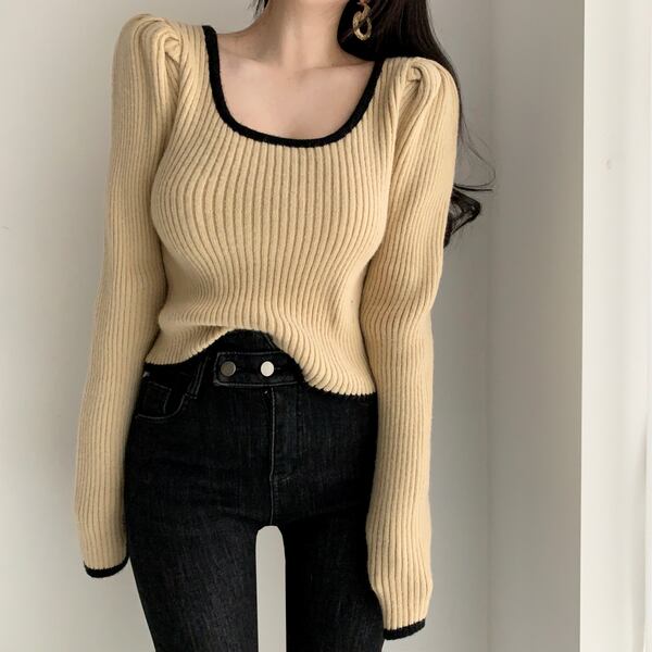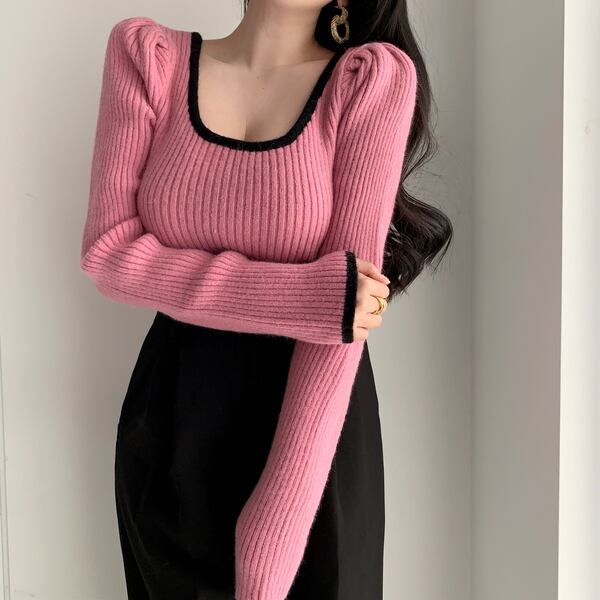 デザインニット レディース 送料無料 2色 リブニット トップス ニット ラウンドネック Uネック バイカラー トリム デコルテ リブ ニット ベルスリーブ パフスリーブ バルーンスリーブ セーター 長袖 ハイネック タートルネック アシンメトリー 切り替えデザイン リブ 大人可愛い きれいめ 上品 モード系 エレガント グレー 高見え 格上げ インスタ映え 春 秋冬 大人 かわいい おしゃれ 普段使い デイリー お呼ばれ お出かけ デート オフィス 通勤 通学 旅行 パーティー 二次会 トレンド