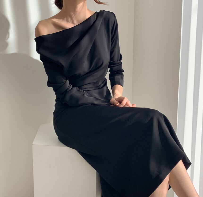 ワンショルダードレス レディース ストラップレス 送料無料 2色 オフショルダー 七分袖 ドレープ ミドル丈 フレアワンピース シャツ ブラウス スリット ボディコンシャス ボタン ボリューム パフ スリーブ 大人可愛い きれいめ シンプル カジュアル 大人 上品 おしゃれ お洒落 こなれ感 ラフ キュート ガーリー ルーズ クール エレガント 存在感 抜け感 黒 ブラック 青 ブルー ストライプ 20代 30代 40代 オフィス ビジネス OL 通勤 学生 通学 デート 着回し 普段使い 韓国 韓国系