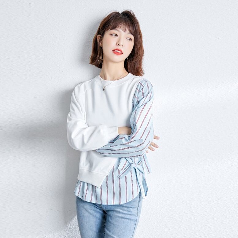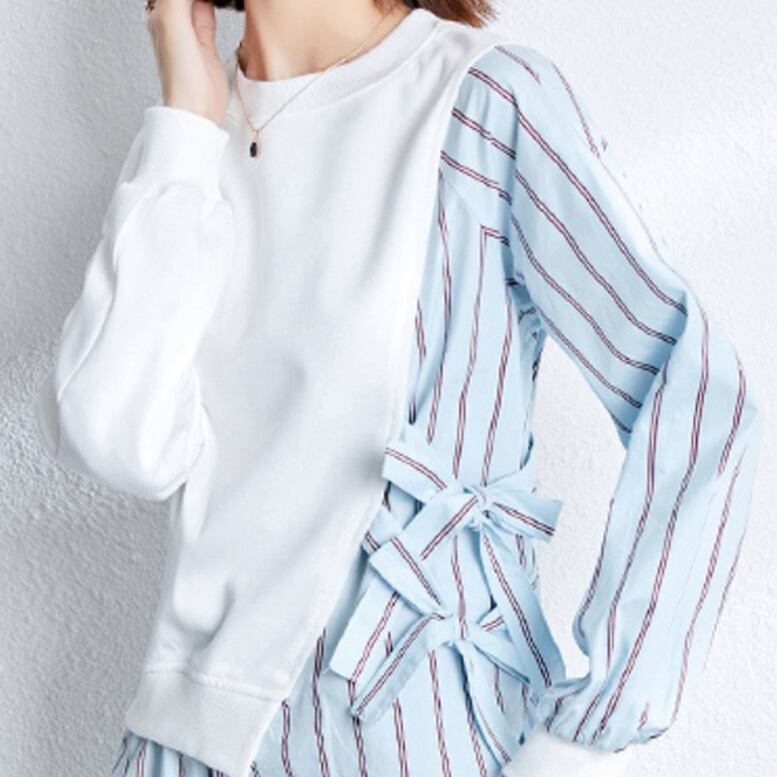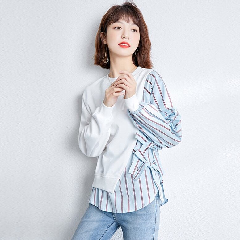 レイヤード風プルオーバー レディース 送料無料 異素材MIXトップス クルーネックミドル丈異素材ドッキングデザインカットソー ブラウス 白トップス サイドリボンストライプシャツドッキングカットソー アシンメトリーストライプシャツ切り替えトップス 長袖 切り替えデザイン リボン ベルト 大人可愛い きれいめ 上品 レトロ 大人女子 こなれ感 キュート ガーリー エレガント 白 ホワイト ストライプ インスタ映え 春夏 秋冬 おしゃれ デイリー お出かけ デート オフィス 通勤 通学 パーティー 二次会