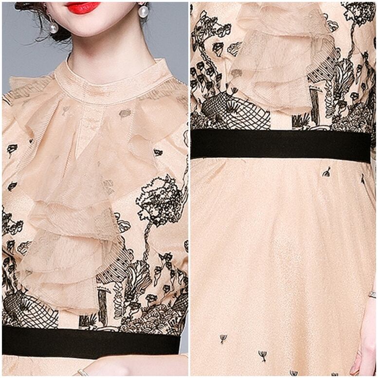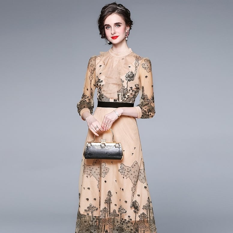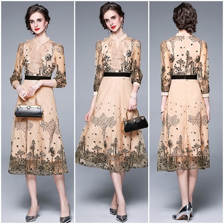 レースワンピース レディース 送料無料 dress フレアワンピース パーティドレス 花柄総レースミモレ丈フレアワンピース・ドレス チュールスタンドカラーフリル7分袖シアードレス ひざ下 ロング 7分袖 レース 刺繍 シフォン ウエストマーク ハイウエスト 透け感 シースルー エレガント 大人可愛い きれいめ 華やか 上品 レトロ ガーリー ベージュ ニュアンスカラー ボヘミアン 披露宴 オケージョン 高見え 春夏 秋 大人 かわいい おしゃれ お呼ばれ お出かけ デート パーティー 二次会 フォーマル
