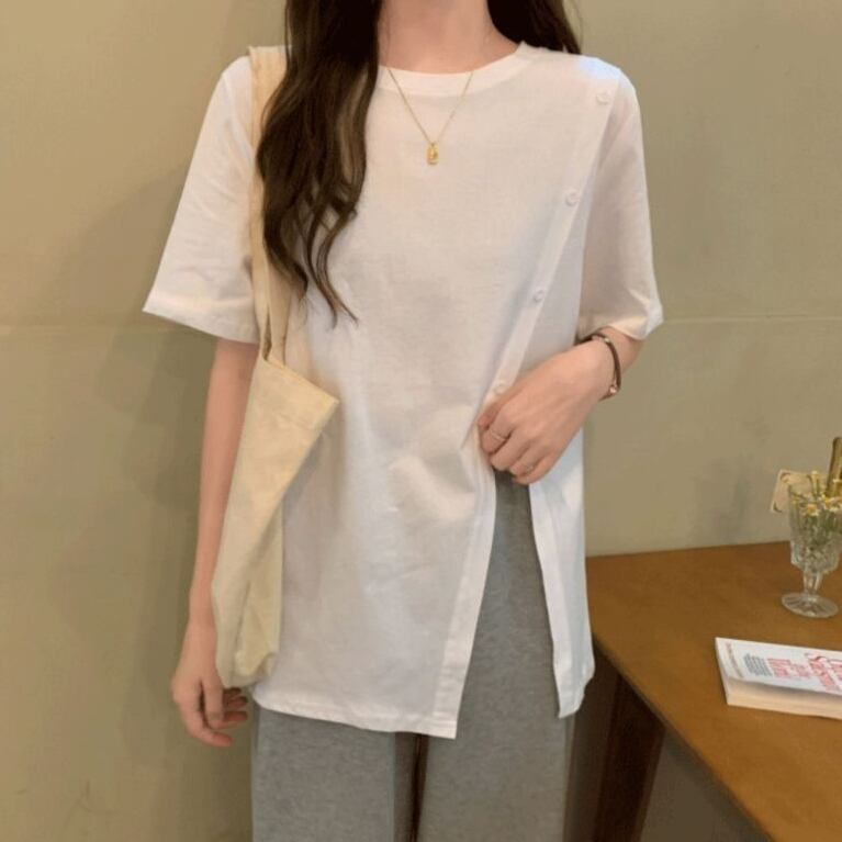 トップス レディース 送料無料 3色 フレンチスリーブTシャツ 半袖 アシンメトリー おしゃれ アシンメトリー スリット ボタン ブラウス スタイル 小顔見せ 着痩せ 体形カバー インスタ トレンド きれいめ コットン 綿 バックボタン オフィス 通勤 OL エレガント フェミニン クール モダン モノトーン カラーバリエーション ブラック ライトグリーン こなれ感 シンプル ベーシック 無地 夏 お出かけ アクティブ かっこいい クルーネック ラウンドネック ティーシャツ ブラウス スリット