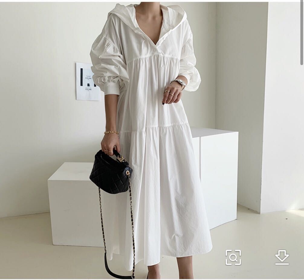 フード付きロングワンピース。