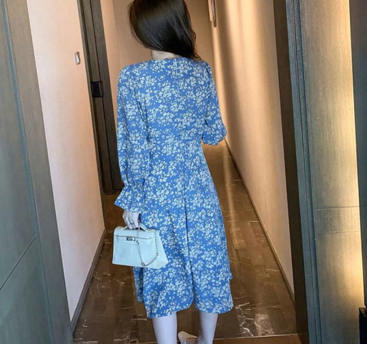ワンピース レディース 送料無料 長袖花柄ワンピース カラバリ1色 サイズ4展開 S M L XL ブルー V ネック 長袖 ミモレ丈 花柄 ワンピース ふんわり ロングワンピース 上品 大人 きれいめ シフォンワンピース Vネックワンピース エレガント 通勤 お出かけ 女子会 ランチ 公園デビュー オフィス ビジネスシーン デイリー 日常 結婚式 二次会 デート ママ友ランチ ディナー パーティー 春 夏 秋 冬 着回し 韓国 韓国ファッション オルチャンカジュアル 20代 30代 40代