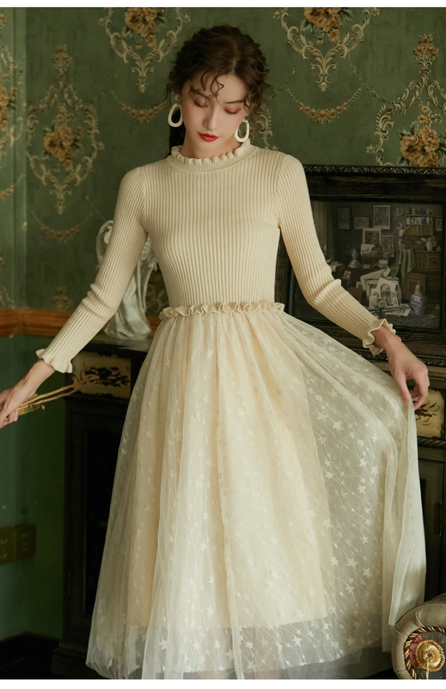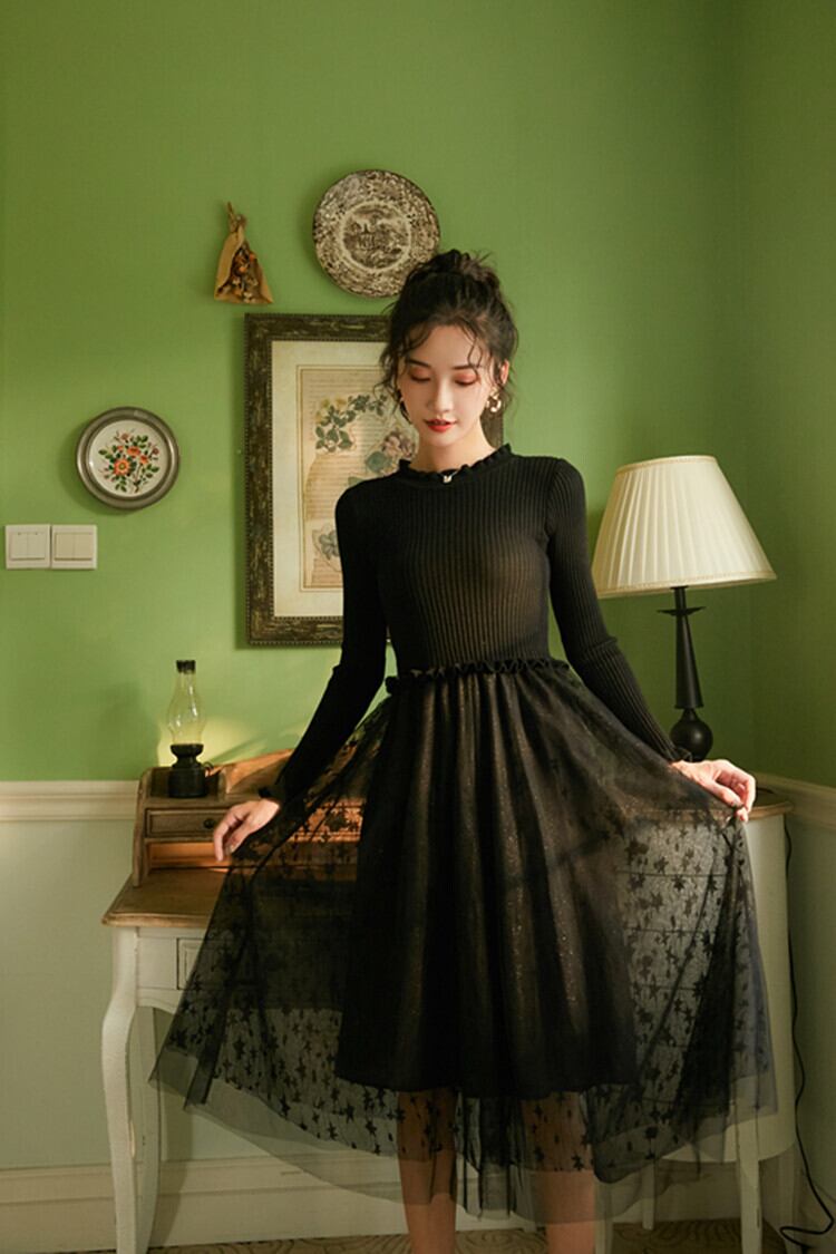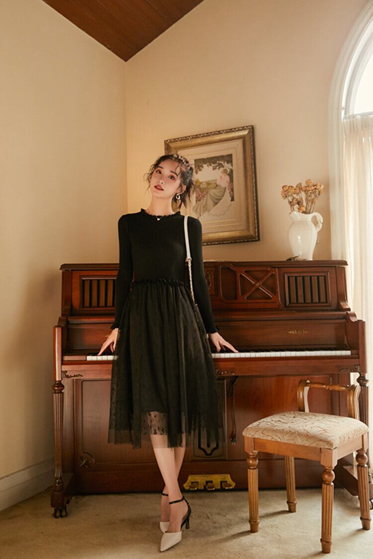 ワンピース レディース 送料無料 おしゃれワンピース カラバリ2色 ブラック オフホワイト 黒 白 サイズ3展開 S M L ミモレ丈 長袖 レーススカート ニットワンピース スリム 大人 異素材ミックス きれいめ おでかけ 通勤 休日 ママ友ランチ ランチ 公園デビュー 20代 30代 40代 幅広い年代 長袖ワンピース 異素材ワンピース ロングワンピース 春 秋 冬 着回し デート ディナー 二次会 パーティー