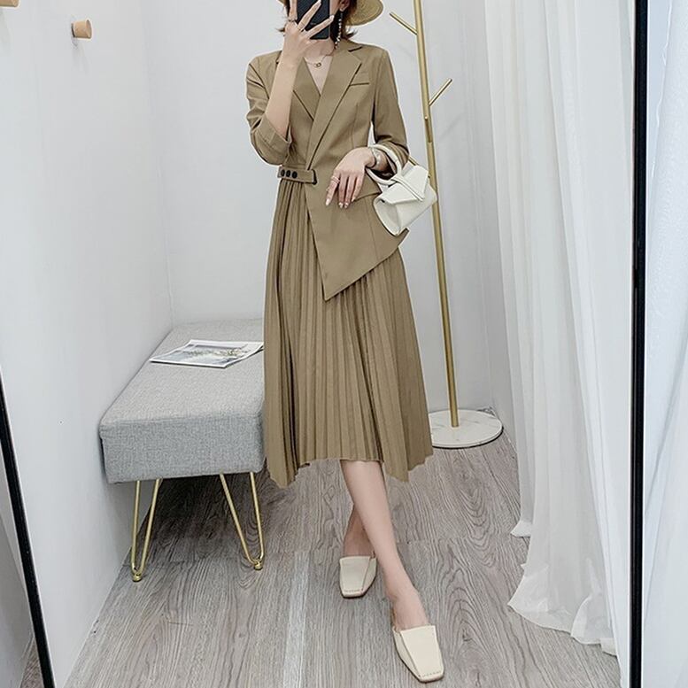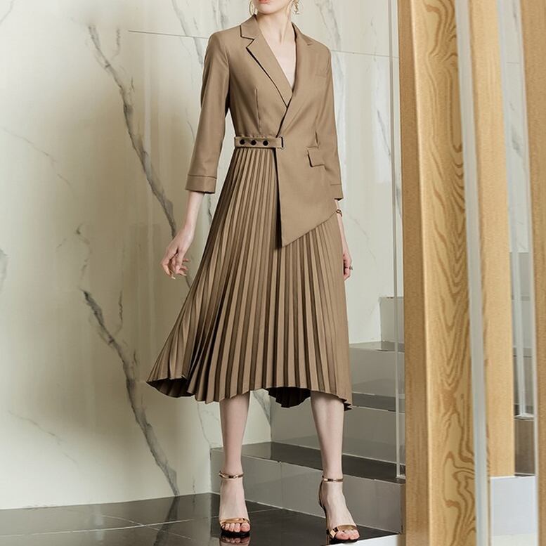プリーツワンピース レディース 送料無料 ドレス dress シャツワンピース 変形プリーツロングワンピース アシンメトリーレーヤード風ひざ下丈ワンピース ウエストマークプリーツジャケットロングワンピース ミモレ 7分袖 長袖 Vネック 襟付き 切り替えデザイン ベルト エレガント 大人可愛い きれいめ 華やか 上品 キュート ガーリー ニュアンスカラー オケージョン 高見え 春夏 秋冬 デイリー お呼ばれ お出かけ デート オフィス 通勤 通学 旅行 パーティー 二次会 フォーマル トレンド