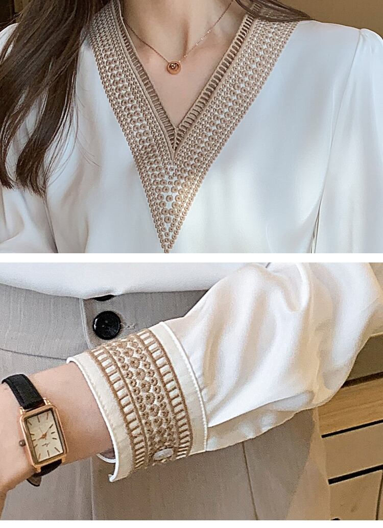 襟元と袖の刺繍装飾が上品な大人っぽいVネックブラウス。