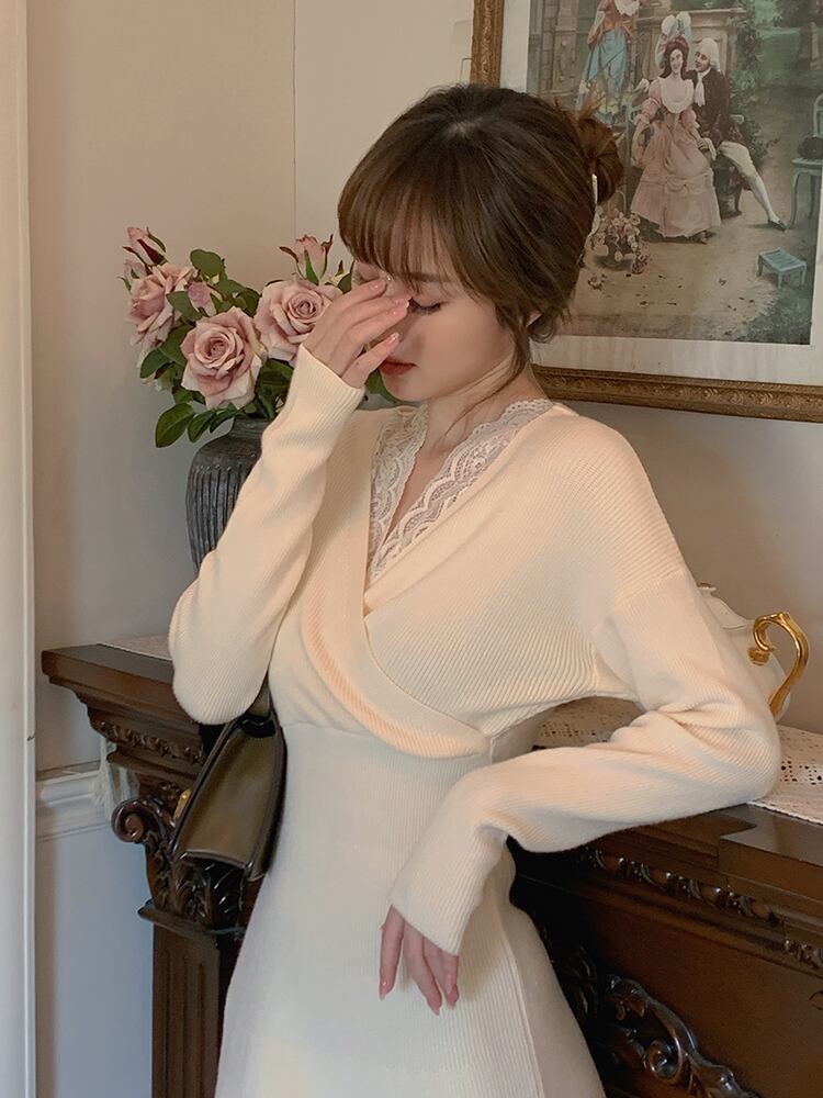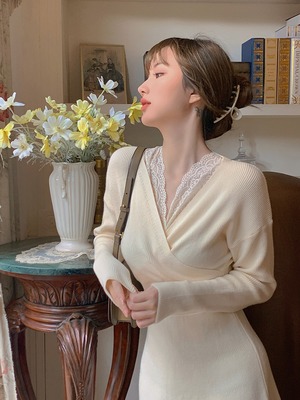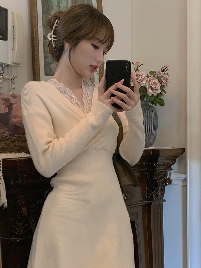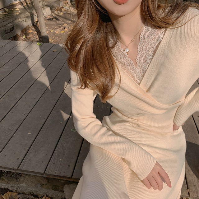 Vネックとの襟元にレースをレイヤードしたワンピースです。
