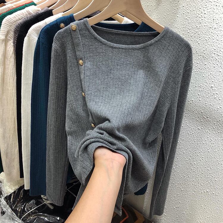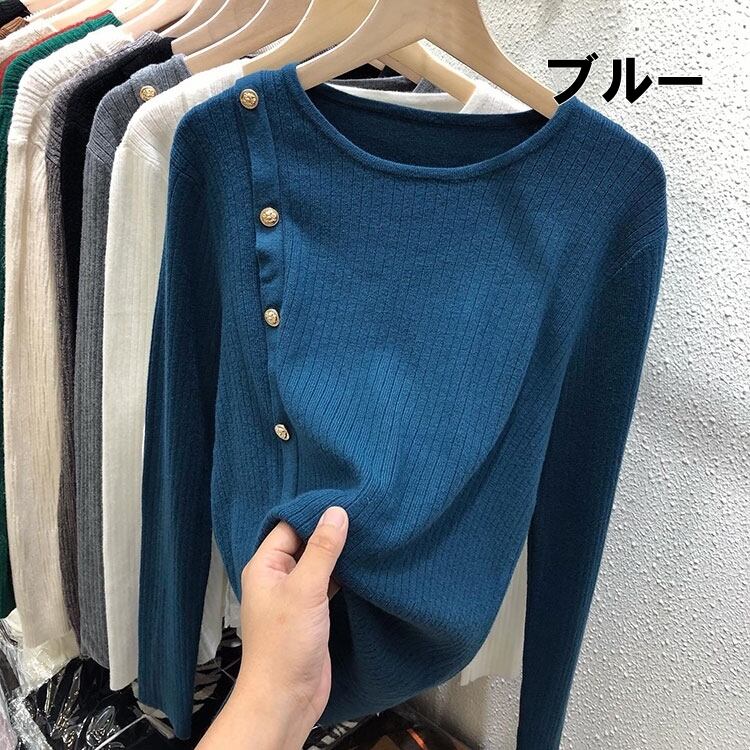 トップス セーター ニット レディース 送料無料 4色 カットソー ニットソー 袖あり 長袖 クルーネック リブニット メタルボタン アシンメトリー 大人可愛い きれいめ シンプル 上品 おしゃれ 大人女子 こなれ感 キュート エレガント モダン 主役級 抜け感 S M L ゆったり 白 ホワイト 黒 ブラック 茶色 ブラウン ベージュ 大人カラー カラバリ 無地 春 秋 冬 20代 30代 ママ オフィス ビジネス OL デート お出かけ イベント 旅行 着回し 普段使い 韓国系 楽ちん 体系カバー
