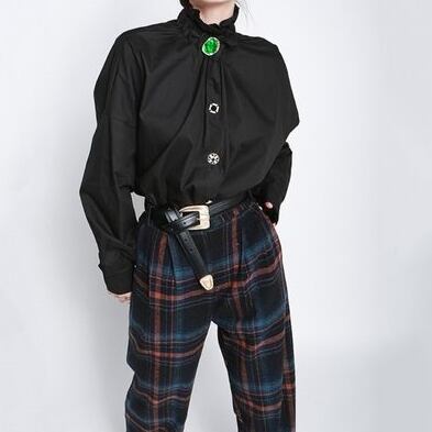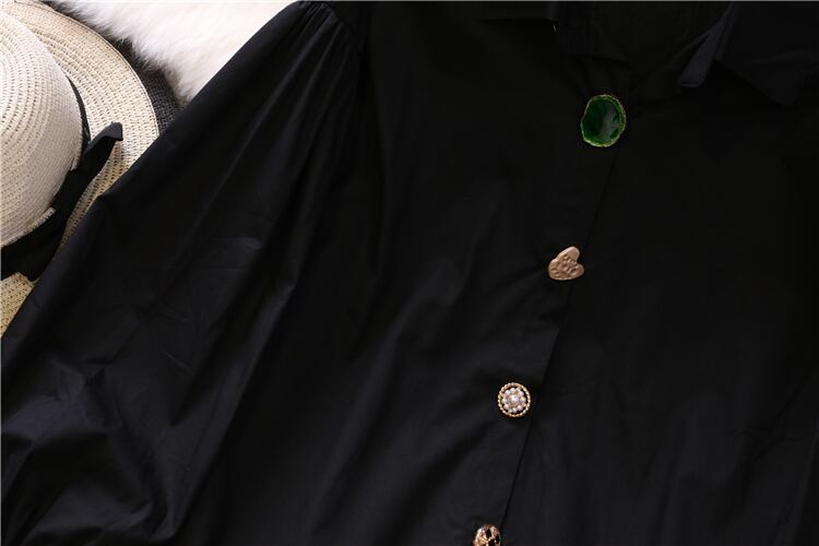 ヴィンテージライクな大きなビジューボタンをあしらったワイシャツです。