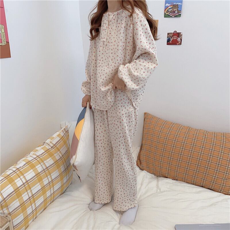 ゆったりシルエットのラフな長袖シャツとパンツのセット。