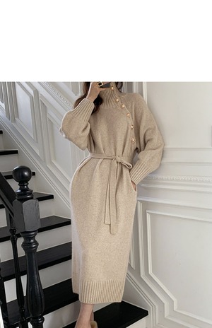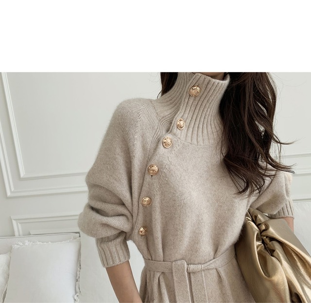 デコルテサイドのメタルボタン装飾がトラッドで上品なニットワンピースです。