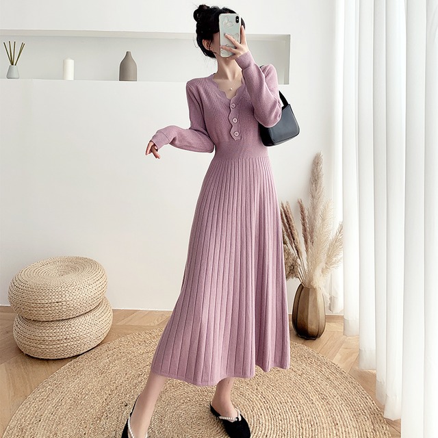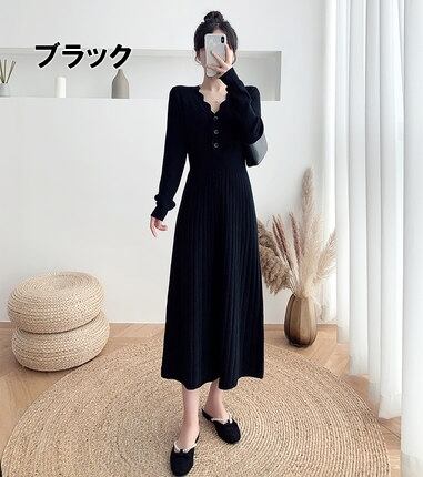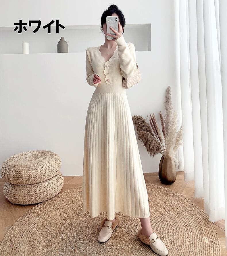 スカラップ襟がレトロで高級感漂うロングニットワンピースです。