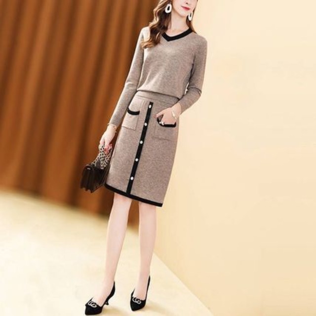 セットアップ トップス スカート 2色 タイトスカート ボトムス セットアップ 膝丈トリム バイカラー ひざ丈 タイト 袖あり 長袖 Vネック スリム タイト 細身 ストレート 上下セット 2点セット かわいい 大人可愛い きれいめ シンプル おしゃれ お洒落 エレガント 青 ブルー 秋 冬 学生 通学 デート お出かけ 女子会 着回し 普段使い 韓国 韓国系 オルチャン ファッション コーデ スタイル モテ 10代 20代 30代 40代 レディース