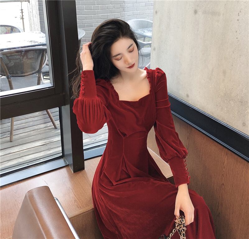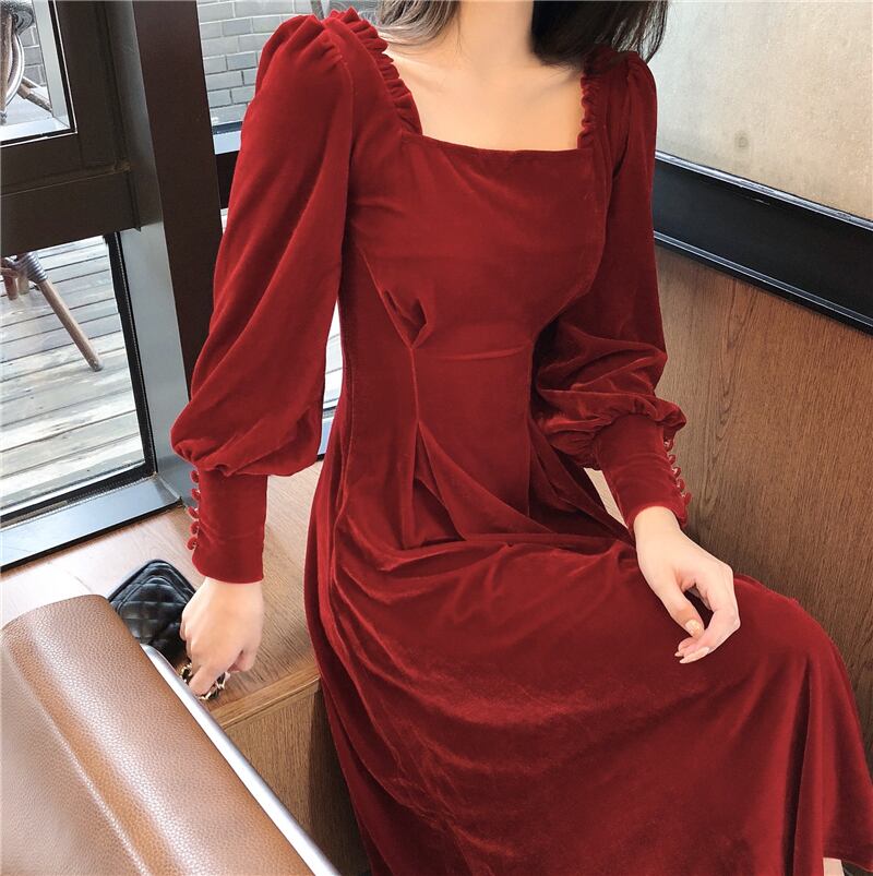 ワンピース レディース 送料無料 2色 長袖 ミモレ丈 ベロア ベルベット スクエアネックドレス レース パフスリーブ シャーリング ドレス パフスリーブ ロング丈 ミモレ丈 アワーグラスライン スイートハートネック ハートシェイプドネック パワーショルダー ランタンスリーブ バルーンスリーブ ボリューム袖 スリット 黒 ブラック アプリコット ベージュ 無地 大人女子 上品 エレガント セクシー きれいめ こなれ感 抜け感 冠婚葬祭 二次会 パーティー おでかけ