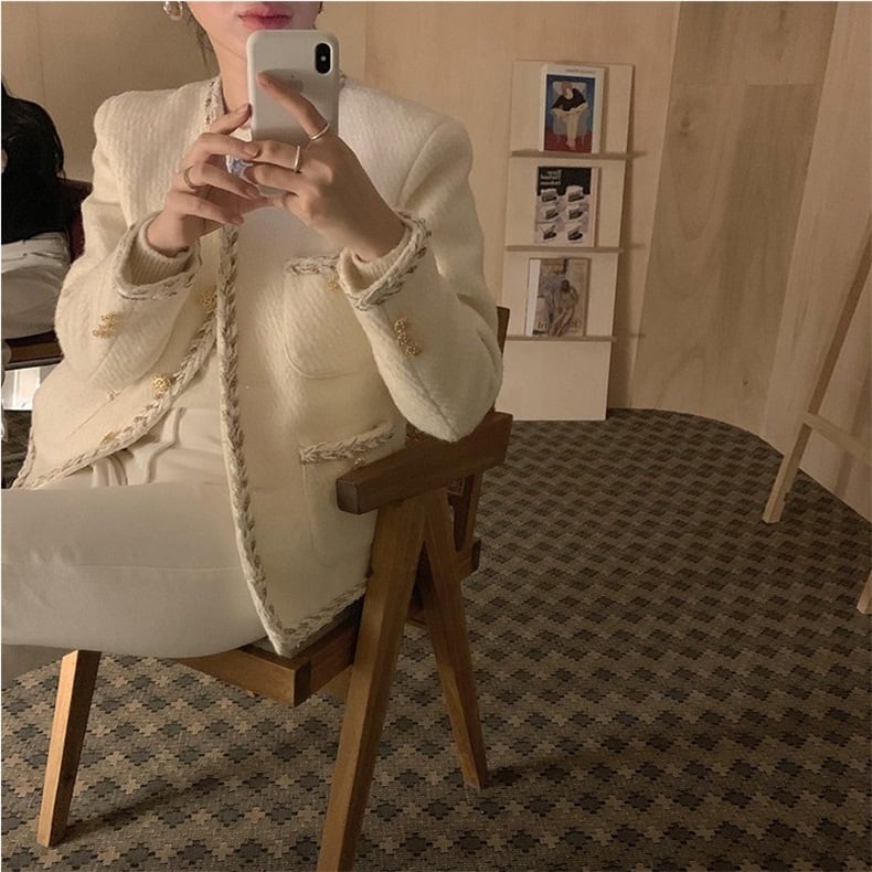 ミディアム丈のツイードノーカラージャケット。