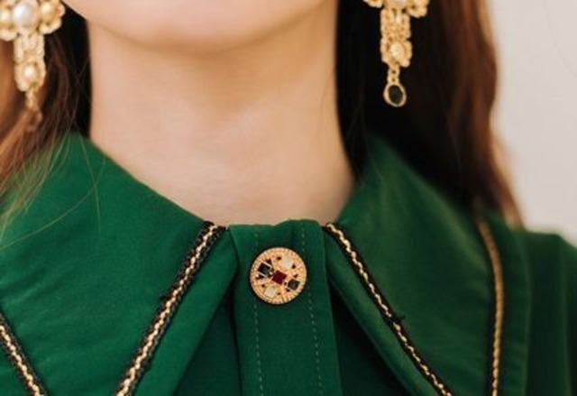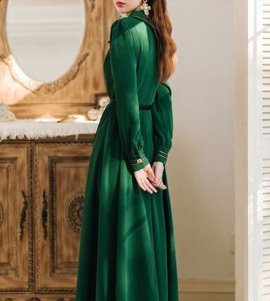 ゴールドのボタンとリボン刺繍がクラシカルでドレッシーなワンピースです。