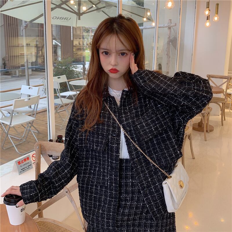 ミディアム丈のノーカラージャケットとミニスカートのセットです。
