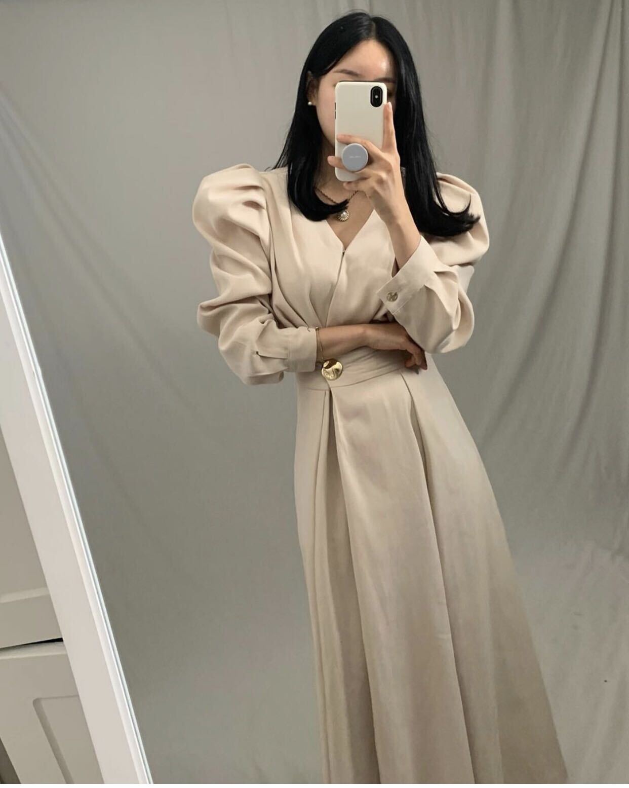 ボリュームスリーブがドレッシーでフェミニンなフレアワンピース。