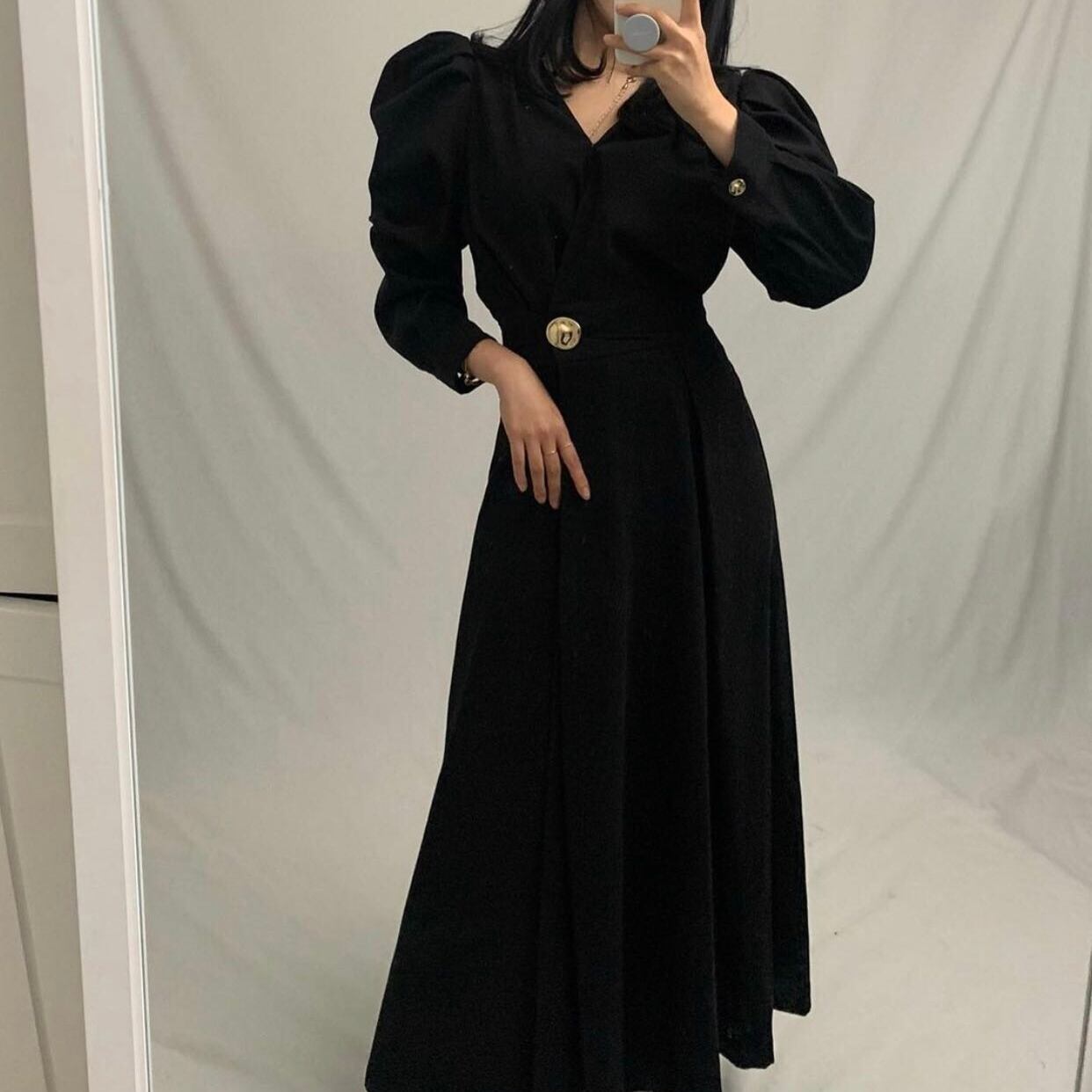 ワンピース レディース 送料無料 2色 メタルボタン フレアワンピース フレア ロング丈 ウエストマーク ギャザー ミモレ丈 クルーネック カシュクール Vネック タック 長袖 ロングスリーブ パフスリーブ ボリューム袖 パワーショルダー ハイウエスト ウエストマーク 体型カバー 二の腕カバー 脚長 細見え スリム フィット感 スタイルアップ ネイビー 紺色 きれいめ 上品 エレガント こなれ感 大人女子 大人可愛い 清楚 清潔感 おしゃれ お洒落 シンプル 春服 秋服 20代 30代 40代 新作