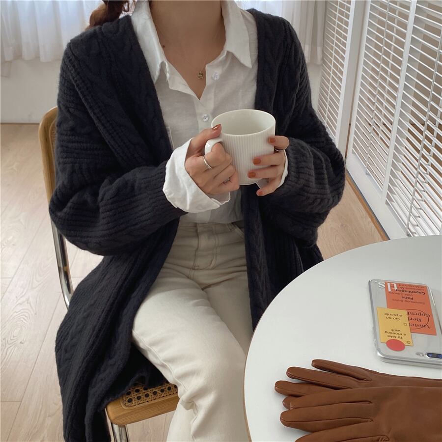 立体感のあるケーブル編みが温かみのあるゆったりカーディガンです。