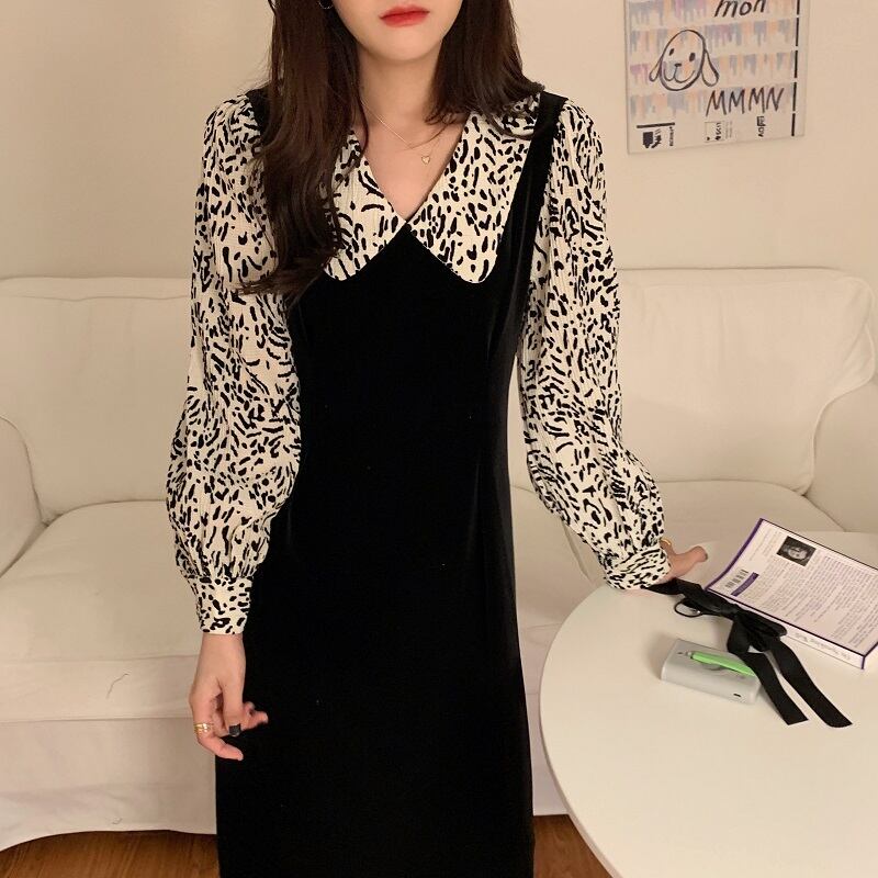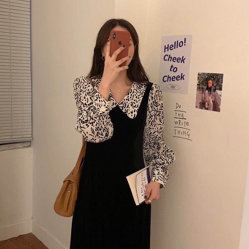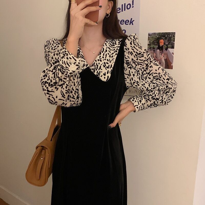 ブラックのドレスとレオパードシャツをレイヤードしたようなワンピースです。