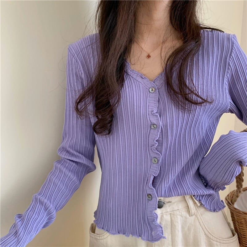 裾と袖のフレアがフェミニンな印象のリブニットカーディガン。